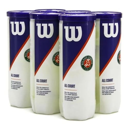 Especificações da Bola de Tênis Wilson Roland Garros - All Court Conheça suas características: - perfil: tênis; - Material: Feltro exclusivo Dura-Weave; - Detalhamento: Pack com 6 Tubos, contendo 3 bolas cada, escrita Wilson Roland Garros na bola, serve para todos os tipos de quadra, bola aprovada pela Federação Internacional de Tênis; - origem: importada.