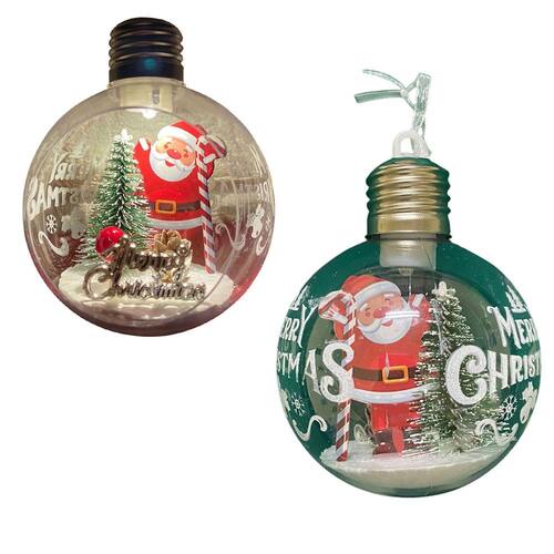 A Bola para árvore de Natal LED Natalina com Papai Noel é a decoração perfeita para tornar seu Natal ainda mais encantador! Com um design criativo e iluminado, essa bola possui um formato de lâmpada e traz a figura adorável do Papai Noel, juntamente de uma árvore de natal e um letreiro escrito 'Merry Christmas', criando um ambiente mágico e acolhedor.