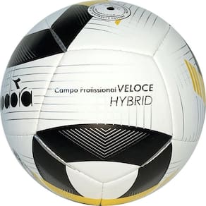 Bola Futebol Campo Veloce Hybrid Diadora Bola Campo Profisional Veloce Hibrid - Cor: Branco/Preto/Prata/Amarelo - Circunferência: 68-69 cm - Peso: 410 - 450 gr. - Gomos: 12 peças - Construção: Dupla construção Termofusão/ costura com menos absorção de água. - Câmara: Especial - Laminado: 100% PU - Válvula: Miolo Removível e Lubrificado.