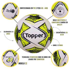 A bola de futebol society oficial 22 fusionada está com um novo design, nova ferramenta de gravação e laminado soft com 2.8 a 3.0mm. Confeccionada em PVC, com tecnologia Tecnofusion onde os gomos são ligados por termofusão, impedindo a absorção de água garantindo maior durabilidade. Cores mais vivas se misturam a um grafismo que dão mais beleza a bola.