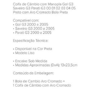 Descrição do produto Bola manopla cambio parati g3 2000/. + coifa aro cromado Mais informações Marca: 60249 Descrição completa Descrição do produto Bola manopla cambio parati g3 2000/... + coifa aro cromado Mais informações Marca: 60249 Descrição completa Bola manopla cambio parati g3 2000/... + coifa aro cromado coifa de câmbio com manopla gol g3 saveiro g3 parati g3 00 01 02 03 04 05 preto com aro cromado bola pretacompatível com: Gol............G3 2000 a 2005 Saveiro....G3 2000 a 2005 Parati........G3 2000 a 2005especificação técnica: Disponível na cor preta Modelo liso Encaixe sob medida Medidas aproximadas dxa : 13x23,5cmconteúdo da embalagem:1 bola de cambio aro cromado +1 coifa de câmbio com aro cromadoimportante: de 3 meses.Valor unitário. Recomendamos que a instalação seja feita por um especializado e, não nos responsabilizamos pelo mau uso do produto. Agradecemos a sua visita Agradecemos a sua visita Marca: Não Informado Ean: 7800000024777