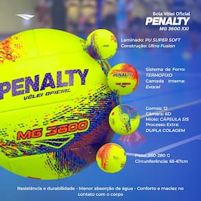 Benefícios: - Conforto e maciez no contato com o corpo. - Resistência e durabilidade. - Menor absorção de água. - Alguns diferenciais técnicos: - A Bola Vôlei MG 3600 Penalty XXI conta com a câmara Airbility 6D que proporciona precisão e controle absoluto durante os toques e jogadas. Seu peso e circunferência são ideais para utilizar com os amigos.