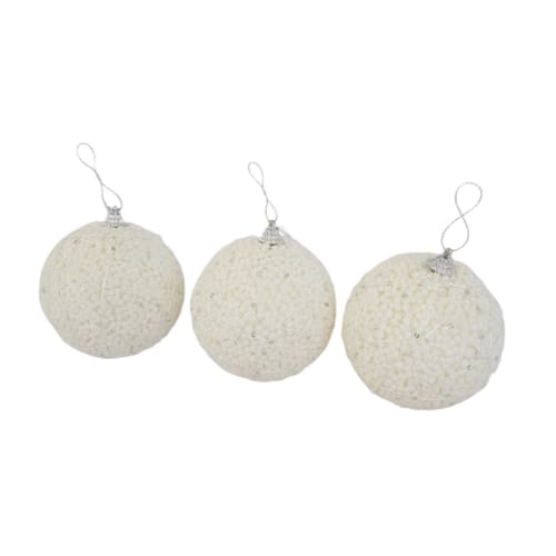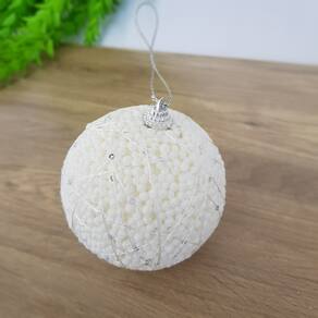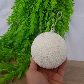 KIT COM 3 BOLAS DECORATIVAS DE NATAL, ESTRUTURA EM EPS REVESTIDAS COM C0RDÃO DE PÉROLAS E RENDA PRATA.