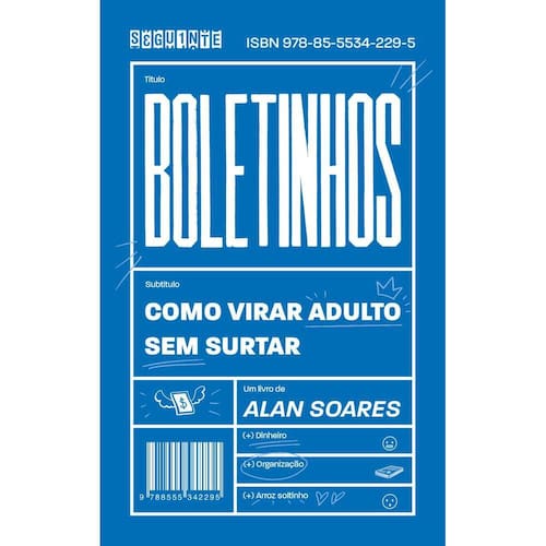 O manual de que todo jovem precisa para encarar a vida adulta e fazer as pazes com o dinheiro. O primeiro emprego, os boletos que não param de chegar, as contas que não fecham, a vida social atribulada Pois é, ninguém falou que ser adulto era fácil, mas você não precisa passar por esse momento sozinho. Boletinhos é o guia perfeito para te acompanhar nessa jornada. O livro explica de forma clara e descontraída como organizar as suas finanças, economizar um pouquinho todo mês e criar hábitos financeiros mais saudáveis. E, como a vida vai muito além do dinheiro, você também vai encontrar orientações sobre assuntos que sempre causam confusão: como montar o currículo perfeito? Como declarar o imposto de renda? Dá para começar a investir já no início da carreira? Alan Soares criou o @boletinhos para levar aos jovens informações mais acessíveis sobre finanças. Agora a página no Instagram virou este guia que mostra como a vida adulta, apesar de complicada, também pode ser a nossa melhor fase com independência e liberdade para trilharmos o nosso caminho.