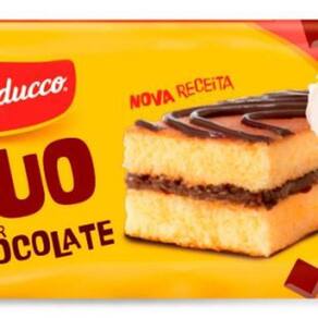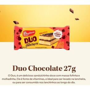Bolinho Duo Chocolate Bauducco 45x27g MiniboloO Duo, é um delicioso sanduichinho doce com massa fofinha e molhadinha. Ele é fonte de vitaminas, e ideal para ser levado na lancheira, ou para ser consumido nos lanchinhos ao longo do dia. Minibolo Duo Chocolate 27g com 15. Marca: BauduccoTabela NutricionalPeso Líq. 27gValor energético 83 kcal 349 kJ 4% Carboidratos 13 g 4% Proteínas 1,8 g 2% Gorduras totais 2,7 g 5% Gorduras saturadas 1,4 g 6% Gorduras trans 0 gFibra alimentar 0,6 g 2% Sódio 48 mg 2% Vitamina B1 Tiamina 0,18 mg 15% Vitamina B2 Riboflavina 0,20 mg 15% Niacina 2,4 mg 15% Vitamina B6 0,20 mg 15% Vitamina A 90 mg 15% Cálcio 150 mg 15%