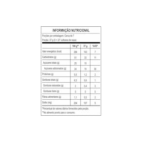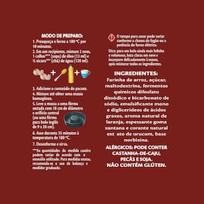Açúcar, farinha de arroz, maltodextrina, fermentos químicos pirofosfato ácido de sódio e bicarbonato de sódio, emulsificante mono e diglicerídeos de ácidos graxos, aroma idêntico ao natural de laranja e espessante goma xantana.