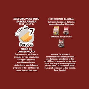 Tio João mistura para bolo sabor laranja é uma combinação perfeita de praticidade e sabor. É produzida com farinha de arroz e não possui glúten em sua composição.