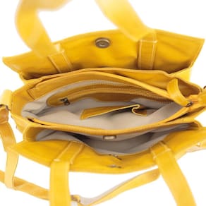 Feita à mão em couro , é um modelo sofisticado e estiloso. Tem duas alças para o ombro e fechamento por zíper. Os bolsos externos com zíper na frente facilitam guardar itens que precisam sempre estar à mão. Tem divisória interna, uma delas com zíper e permite que se use como 3 divisórias diferentes. Altura 29 cm Largura 29 cm. Peso 500gr. Ficha técnica - Largura: 29 cm - Cor principal: Amarelo - Desenho do tecido: Liso - Com correia removível: Não - Materiais: Couro - Comprimento da alça: 1,25 - Profundidade: 27 cm - Com fecho: Sim - Gênero: Feminino - Quantidade de bolsos externos: 1 - Com correia ajustável: Sim - Ocasiões: Casual - Idade: Adultos - Tipo de bolsa: Transversal - Quantidade de bolsos internos: 3 - cor: amarelo - Tipo de fechamento: Zíper - Temporada de lançamento: Outono-inverno - Fonte do produto: Betania Couros - Ano de lançamento: 2021 Marca: Betania Couros Ean: 7895555325042