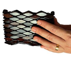 Bolsa confeccionada com pecinhas de madeira no formato de pequenos losângulos, pintados e envernizados, na cor marrom escura, com acabamento interno em cetim e fechamento com zíper.