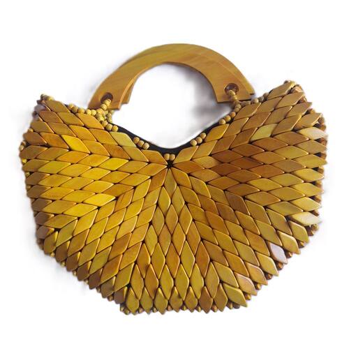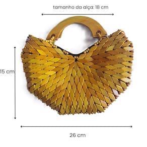 Bolsa confeccionada com pecinhas de madeira no formato de pequenos losângulos, pintados e envernizados, Amarela, com acabamento interno em cetim e fechamento com zíper. Alça CURTA de MADEIRA formato meia lua com 18 cm diâmetro. A bolsa é arredondada em formato de meia lua com profundidade de 6 cm.