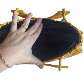 Bolsa Artesanal Peças Madeira Envernizada Amarela, Meia Lua, com Zíper e interior em tecido cetim