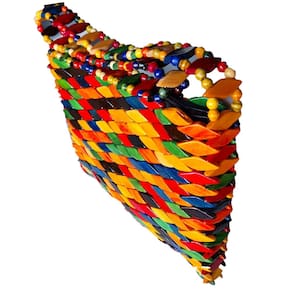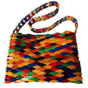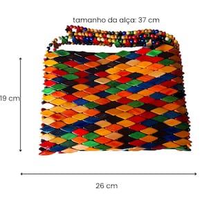 Bolsa confeccionada com pecinhas de madeira no formato de pequenos losângulos, pintados e envernizados, em diversas cores, com acabamento interno em cetim e fechamento com zíper. Alça MÉDIA feita do mesmo material medindo 37 cm.