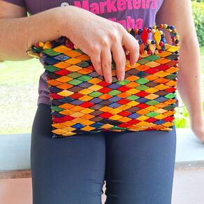 Bolsa Artesanal em Peças de Madeira Envernizada Colorida, Alça Média, com Zíper e interior em tecido cetim