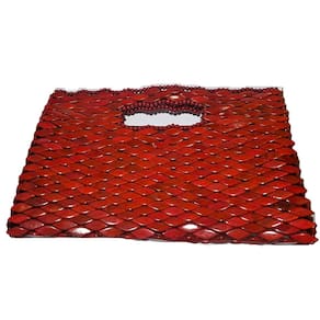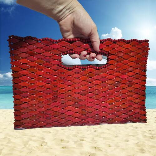 Material: Madeira polida de alta resistência. Cor: Vermelho vibrante com variação tonal suave. Formato: Retangular, com bordas arredondadas para maior conforto. Alça: Embutida, prática e ergonômica. Acabamento: Detalhes em contas na borda superior, adicionando um toque artesanal sofisticado. Dimensões: Compacta e funcional, ideal para carregar itens essenciais.