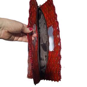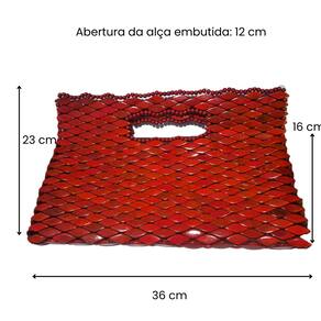 Bolsa confeccionada com pecinhas de madeira no formato de pequenos losângulos, pintados e envernizados, vermelha, com acabamento interno em cetim e fechamento com zíper. Alça CURTA de MADEIRA formato retangular.