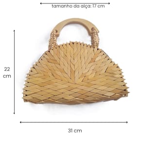 Bolsa confeccionada com pecinhas de madeira no formato de pequenos losângulos, pintados e envernizados, madeira clara, com acabamento interno em cetim e fechamento com zíper. Alça CURTA de MADEIRA formato redonda com 24 cm diâmetro.