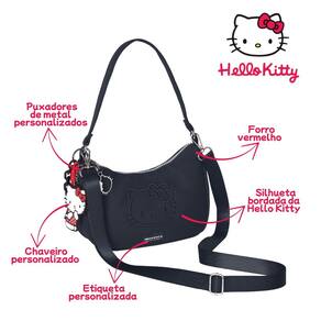 Características Bolsa: - Confeccionada em nylon - Silhueta bordada da Hello Kitty - Puxadores de metal personalizados - Forro personalizado - Chaveiro personalizado - Etiqueta em patch de PVC silkado