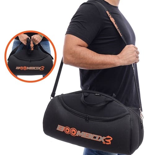 MATERIAL EXTERNO: Ny-lon Reforçado Impermeável. PREENCHIMENTO: E-VA de alta densidade de 5 mm. MATERIAL INTERNO: Forro Poliéster Atoalhado na cor laranja. ALÇAS: Fita de Poliéster Ultra resistente com regulagem de altura da alça. BOLSO: Neo - prene com Elasticidade e impermeável. FECHAMENTO: Zíp-er de alta resistência.