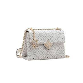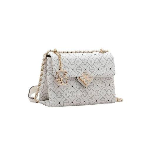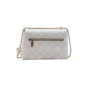 texturizado e monograma elegante, ela possui alça em corrente com detalhes em couro sintético, que permite o uso transversal ou no