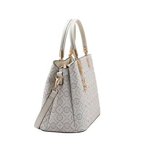 Conta com alça de mão e alça transversal removível e ajustável, ferragens douradas e chaveiro metálico da marca.