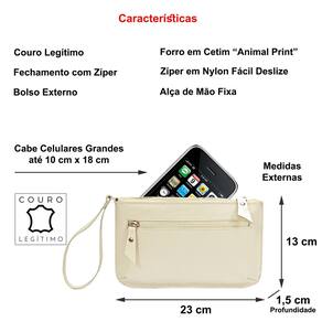 Bolsa clutch, carteira de mão e porta celular em COURO 100% autêntico, muito versátil e prática, possui 1 bolso externo fechado por zíper para pequenos objetos, todos os metais (argola, mosquetões, zíperes, etc) são na cor prata. O fechamento principal é feito com zíper em nylon de fácil deslize. Possui alça externa de mão, excelente para uso no dia a dia. Possui a medida ideal para levar pequenos objetos, carteiras pequenas, celulares de tamanhos médio e grande, etc.