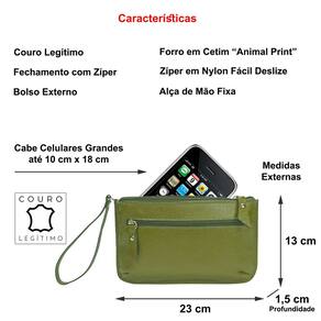 Bolsa clutch, carteira de mão e porta celular em COURO 100% autêntico, muito versátil e prática, possui 1 bolso externo fechado por zíper para pequenos objetos, todos os metais (argola, mosquetões, zíperes, etc) são na cor prata. O fechamento principal é feito com zíper em nylon de fácil deslize. Possui alça externa de mão, excelente para uso no dia a dia. Possui a medida ideal para levar pequenos objetos, carteiras pequenas, celulares de tamanhos médio e grande, etc.