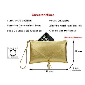 Linda Bolsa Clutch Carteira de Mão ! Uma ótima escolha para finalizar uma produção arrasadora. Bom espaço interno para carregar o essencial. Possui um lindo detalhe com franja de couro para dar uma sofisticação e charme ao produto. Feita em couro, muito versátil e prática, todos os metais (argola, mosquetões, zíperes, etc) são dourados para dar um ar de sofisticação e elegância. Na parte interna possui forro em cetim com textura "animal print", o fechamento principal é feito por zíper para sua maior segurança. Possui alça externa de mão removível. Versátil, pode ser usada desde um evento social até uma festa casual ou balada. Possui a medida ideal para levar celulares grandes, pequenos objetos e o mínimo necessário para seu evento ou passeio.