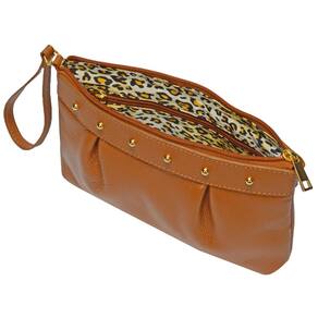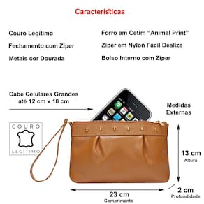 Bolsa clutch, carteira de mão e porta celular em COURO, delicada, elegante, moderna e prática, possui 1 bolso interno fechado por zíper para pequenos objetos, todos os metais (argola, mosquetões, zíperes, etc) são na cor dourada. O fechamento principal é feito com zíper em nylon de fácil deslize. Possui alça fixa externa de mão. Ela tem a medida ideal para levar pequenos objetos, carteiras pequenas, celulares de tamanhos médio e grande, etc.