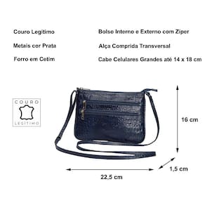 Bolsa Transversal em Couro Feminina Pequena com Bolsinho Externo e Interno Metais na cor Prata Marca Madamix Bolsinha estruturada, pequena, feminina, transversal em couro, com alça comprida para uso transversal ou tiracolo lateral com regulagem de tamanho / altura. Metais na cor prata e couro com textura. Pode ser usada no dia a dia ou como uma peça curinga para finalizar seu look em seus eventos sociais, festinhas e baladas. O forro é confeccionado em cetim com texturas variadas tipo 'animal print' (padrão oncinha) ou similar, que valorizam ainda mais o produto. Possui 2 bolsinhos externos e 1 bolsinho interno ambos fechados com zíper para organizar pequenos objetos. O fechamento da parte superior principal é em ziper de metal que proporciona um fácil deslize, elegância e segurança aos seus objetos. SOBRE O MODELO TRANSVERSAL / TIRACOLO LATERALA principal característica dessa bolsa é a praticidade, conta do design atemporal que se encaixa nas mais variadas ocasiões e seguem super em alta, é uma das opções para quem adora construir looks modernos e descontraídos.Ela vem há anos sendo usadas por mulheres em looks casuais, que em dias atuais ganha uma nova cara transformando em looks mais elaborados que vão do clássico ao esporte chique. O QUE CABE ?Documentos pessoais, celulares tamanhos grandes até 18 cm comprimento por 14 cm largura, carteiras femininas médias, itens de maquiagem, etc. O QUE NÃO CABE ?Sombrinhas, tablets e objetos maiores que 18 cm por 14 cm BENEFÍCIOS1. Somos LOJA DE FÁBRICA, então conseguimos oferecer um produto de qualidade com excelente preço para o comprador final.2. Atendimento pós venda para suprir todas as suas necessidades desde o momento da compra até a entrega do produto.3. Produto em couro (100% autêntico) que oferece maior beleza, durabilidade, resistência, sofisticação e elegância. 4. Produto com design moderno e atual.5. Matéria prima (couro, metais, forro, zíperes, etc) de primeira qualidade. 6. Garantia de Fábrica contra defeitos de fabricação.7. MADE IN BRAZIL - Produto orgulhosamente BRASILEIRO, que gera empregos e ajuda no desenvolvimento do nosso país.CARACTERÍSTICASModelo: Bolsa estruturada, pequena, transversalFechamento da Bolsa : Zíper de MetalBolso Interno : Sim, 1 bolso fechamento com zíperBolso Externo: Sim, 2 bolsos fechamento com zíperDivisão Interna: Possui 1 divisão internaAlça Comprida: Sim, medindo 01 cm de largura por 140 cm de comprimento, com regulador de comprimento / tamanho. MEDIDAS EXTERNAS Comprimento: 22,5 cmAltura: 16 cmLargura/Profundidade: 1,5 cmMATERIAISCouro com textura de origem BovinaMetais: (Fechos, argolas, rebites, puxadores etc.) com banho dourado e antioxidanteForro: Cetim com texturas variadas, tipo animal print (padrão oncinha) ou similarCostura na cor do couroZíperes: parte externa de metal cor prata, parte interna de nylon, ambos marca YKKGARANTIA E QUALIDADEGarantia - 3 meses contra defeitos de fabricaçãoQualidade - Nossos produtos são confeccionados com matéria prima e acabamento de excelente qualidade INFORMAÇÕES GERAISMade in Brazil - LOJA DE FÁBRICA (Produto fabricado por Madamix – Bolsas e Acessórios em Couro)