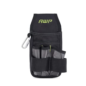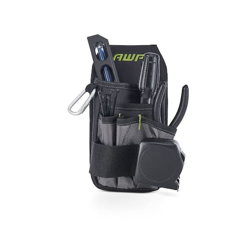 AWP Bolsa organizadora de ferramentas | 7 bolsos e laços para organização de ferramentas | Acessório de clipe de cinto de metal resistente - AWP A bolsa de ferramentas com clipe de cinto possui 7 bolsos e laços para garantir que suas ferramentas estejam organizadas e próximas à mão - Construído a partir de poliéster reforçado resistente à água que é construído para lidar com quaisquer condições no local de trabalho - Inclui mosquetão para prender pequenas ferramentas ou chaves. Também possui bolsos internos elásticos para organização, tornando-a ideal como bolsa de ferramentas para eletricistas, bem como para outros projetos de local de trabalho - Prenda a bolsa de ferramentas ao cinto de ferramentas com laço de túnel ou clipe de metal - A bolsa de ferramentas apresenta um design preto e verde