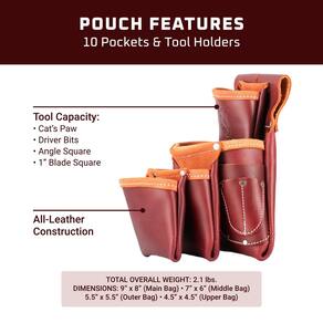- Características: com quatro compartimentos empilhados, esta bolsa de couro é ideal para emolduradores, carpinteiros em geral e comerciantes que preferem uma configuração de alta capacidade. O couro de flor integral é feito para durabilidade a longo prazo.
