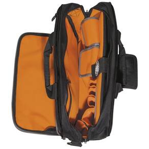 Este Tool Organizer Tech Bag possui um compartimento separado que mantém o laptop protegido de outras ferramentas. A bolsa de ferramentas inclui espaço de zenamento para adaptadores e cabos. Bolso com zíper para arquivos e documentos. Bolso organizador para canetas, telefone, cabos e muito mais. 22 bolsos para toneladas de zenamento de ferramentas. Interior laranja para encontrar ferramentas mais rapidamente. Guardas de proteção e material resistente à água na parte inferior protegem dos elementos Marca: Não Informado