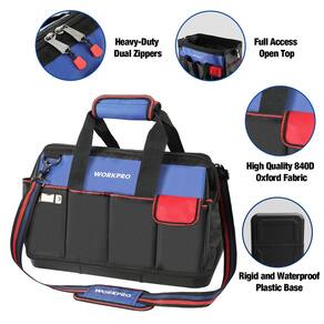 WORKPRO Bolsa de ferramentas, bolsa de ferramentas de 45 cm com base moldada à prova d'água, bolsa organizadora de ferramentas aberta com 20 bolsos, alça de ombro ajustável - Materiais e construção atualizados: a bolsa de ferramentas é composta principalmente de tecido oxford 840D e 600D de alta qualidade, oferecendo durabilidade e confiabilidade incomparáveis, o tecido duplo com costura fina de todo o corpo da ferramenta torna a bolsa extremamente resistente e duradoura. - Vários bolsos e grande espaço interior: projetado com um grande espaço interior (tamanho: 45,7 cm x 32 cm x 25,4 cm), este organizador de ferramentas pode atender às suas necessidades diárias e 8 bolsos internos resistentes e 12 bolsos externos mantêm seu equipamento organizado e seguro, chega de procurar na bolsa. - Parte inferior reforçada: o fundo de plástico resistente à prova d'água oferece uma superfície plana para manter a bolsa de ferramentas na vertical em qualquer ambiente e protege suas ferramentas na bolsa de quedas fortes, mantém sua bolsa seca e não precisa se preocupar com a ferrugem das ferramentas. - Boca aberta: projetada com boca larga e uma estrutura interna de metal mantém a parte superior desta bolsa aberta, o que torna mais conveniente colocar ou retirar suas ferramentas rapidamente quando necessário. - Alça acolchoada e alças de ombro ajustáveis: a alça extra acolchoada e a alça de ombro ajustável podem aliviar a fadiga da mão, a pressão do ombro e adicionar conforto extra ao carregar cargas pesadas, você pode escolher uma variedade de maneiras de carregar e ajustar o comprimento como quiser.