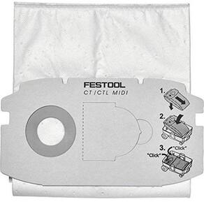 Este design exclusivo da bolsa elimina o aglomeração no interior da bolsa de filtro, um problema comum com a maioria dos sacos de filtro. A aglomeração leva a uma redução na eficiência de sucção e pode, em última análise, causar falha prematura do motor devido a tensão adicional. A bolsa é projetada para caber Extrator de pó Midi Festool CT. - Material de lã durável e autolimpante - Ajusta-se Festool CT MIDI extractores de pó - Inclui cinco sacos de filtro