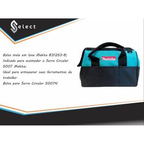 Características: Bolsa mala em lona Makita 831253-8; Indicada para acomodar a Serra Circular 5007 Makita; Ideal para armazenar suas ferramentas de trabalho. Bolsa para Serra Circular 5007N Ficha Técnica: Material: Lona Itens Inclusos: 1 Bolsa de lona Makita 831253-8. Garantia de Fábrica: 12 meses. Medidas aproximadas do produto - Comprimento: 40 cm - Altura: 7 cm - Largura: 23 cm - Peso: 930 g Ean: 7895518008111