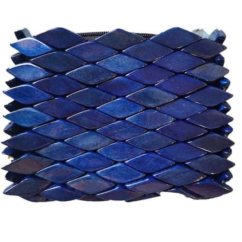 Bolsa confeccionada com pecinhas de madeira no formato de pequenos losângulos, pintados e envernizados, cor Azul, com acabamento interno em cetim e fechamento com zíper.