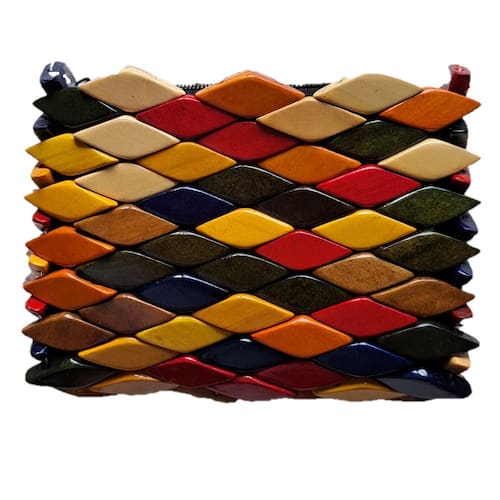 Bolsa confeccionada com pecinhas de madeira no formato de pequenos losângulos, pintados e envernizados, Colorida, com acabamento interno em cetim e fechamento com zíper.