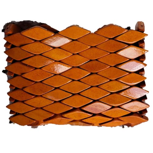 Bolsa confeccionada com pecinhas de madeira no formato de pequenos losângulos, pintados e envernizados, cor Madeira Clara, com acabamento interno em cetim e fechamento com zíper.