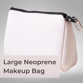 - Cores pop-up – Bolsas elegantes e elegantes com zíper. Esta cor atemporal é uma beleza que combina com tudo. Se você descrever seu estilo como clássico, esta cor da nossa bolsa de maquiagem grande de neoprene é uma obrigação para você.