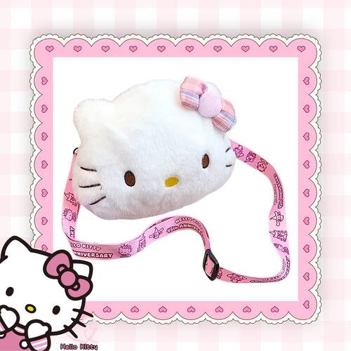 - Material: Pelúcia macia e resistente - Alça: De ombro, confortável e ajustável - Fechamento: Zíper seguro para proteger seus pertences - Design: Formato inspirado na Hello Kitty, com detalhes delicados - Ideal para: Passeios, uso casual e presente especial