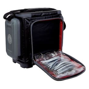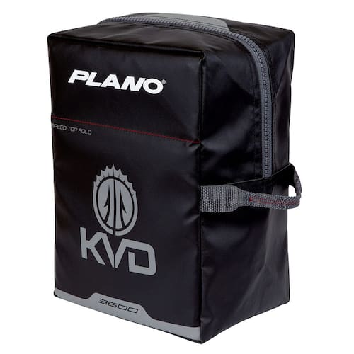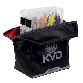 Plano Bolsa Speedbag KVD Wormfile Signature Series 3600, tecido preto revestido de TPE com interior e detalhes vermelhos, bolsa de pesca macia premium, armazenamento para iscas e iscas