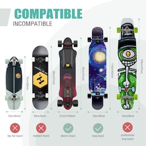 -?Ampla gama de aplicações?O tamanho da mala de viagem do skate é de 44,9 x 12,6 polegadas e é adequado para skates com um tamanho de 42/43 polegadas (cerca de 110 cm). Design clássico em preto, simples e atraente, cheio de estilo de rua moderno, adequado para você sair para praticar skate. Ao mesmo tempo, também é muito adequado para presentear familiares e amigos como presente de Natal, eles vão adorar.