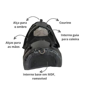 A parte externa da bolsa é feita de material impermeável, o que proporciona proteção contra possíveis chuvas e sujeiras. E para garantir a segurança do seu pet, a bolsa possui uma guia interna para fixar a coleira, evitando que seu amigo escape durante o trajeto.