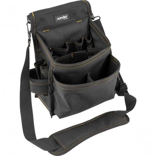Confeccionada em lona reforçada. Acompanha alça tiracolo ajustável, com apoio de ombro almofadado e sistema de fixação através de presilhas metálicas. Possui 20 bolsos/divisões e 1 suporte lateral.