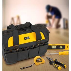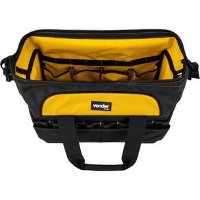 Confeccionada em lona reforçada com abertura total. Conta com alça de transporte fixa e zíper extra reforçado. Além de possuir fundo plástico reforçado à prova dágua, conta ainda com 16 divisões/bolsos na parte externa e 25 divisões/bolsos na parte interna.