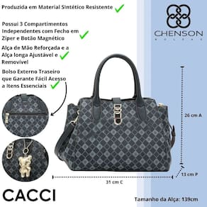 A bolsa feminina Chenson é o equilíbrio perfeito entre elegância e funcionalidade. Produzida em material sintético resistente, apresenta acabamento de alta qualidade e estampa moderna, ideal para quem busca estilo em todas as ocasiões. Seu design estruturado garante um visual sofisticado e versátil, combinando facilmente com looks casuais ou formais.