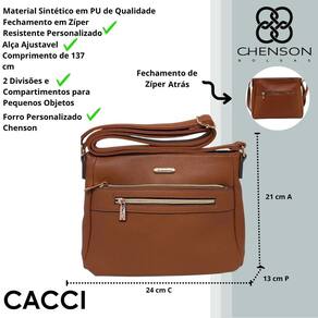 Com alça ajustável de cento e trinta e sete centímetros, a bolsa oferece liberdade para ser usada tanto no ombro quanto na transversal, se adaptando ao seu estilo e necessidade. O fechamento em zíper traseiro amplia o espaço de uso e facilita o acesso aos itens essenciais. O forro interno personalizado Chenson reforça o padrão de qualidade e o cuidado nos acabamentos. Uma bolsa pensada para mulheres que valorizam elegância, versatilidade e funcionalidade em um só acessório.