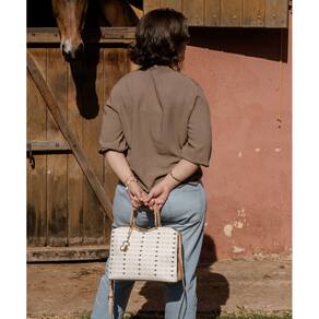 DESCRIÇÃO DO PRODUTO Modelo: Bolsa Feminina Estruturada Cristal Monograma Marca: Chenson Material: Poliuretano impermeável Cor: Bege Fechamento: Zíper Divisórias: 3 compartimentos principais
