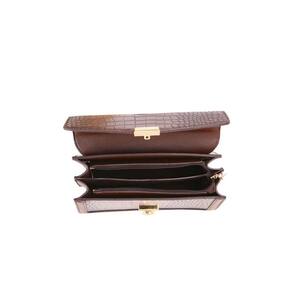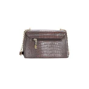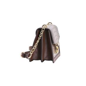Material poliuretano Fechamento com zíper Forro em tecido personalizado Compartimento para pequenos objetos Bolso interno Detalhes na frente Alça em poliuretano com detalhe acorrentada Acabamento em costura contrastante Medidas aproximadas 20 cm de comprimento 11 cm de altura 6 cm de largura