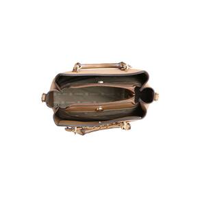 Possui três divisórias que facilitam a organização, além de alças de mão e alça transversal removível para diferentes formas de uso. Acompanha um prático chaveiro de espelho, unindo charme e funcionalidade.
